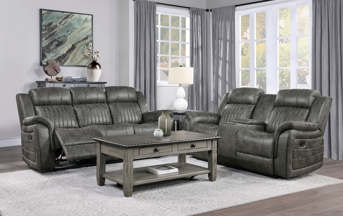 The design of the Centeroak Collection provides a platform for your relaxing downtime. From the classic transitional style to the versatile neutral color of the brown-ish gray polished microfiber fabric covering, this love seat is the perfect addition to your living room. Plush seating features vertical tufting, pillow-top arms, enhanced by the dual end recliners of the love seat. Creating additional function is the center console providing secure placement of beverages and lift top hidden storage. The reclining mechanism is engaged with a pull of the side mounted tabs, taking you from seated to prone in an easy motion.Read More