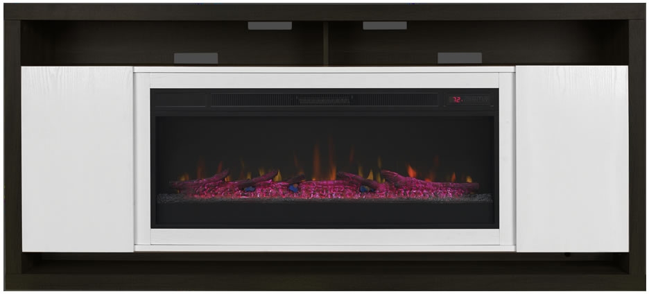 Get an ultra modern look with the Bal Harbor TV stand for TV up 80". The two-toned finish in Black Walnut and White gives this unit an elegant flair. An open full-length partitioned shelf provides storage and display for media components. Two side cabinets with adjustable shelves offer more storage for A/V components and accessories. Integrated wire management system hides and routs all unsightly cables and wires. Add a 42" Classic Flame electric fireplace insert to customize this unit (sold separately).