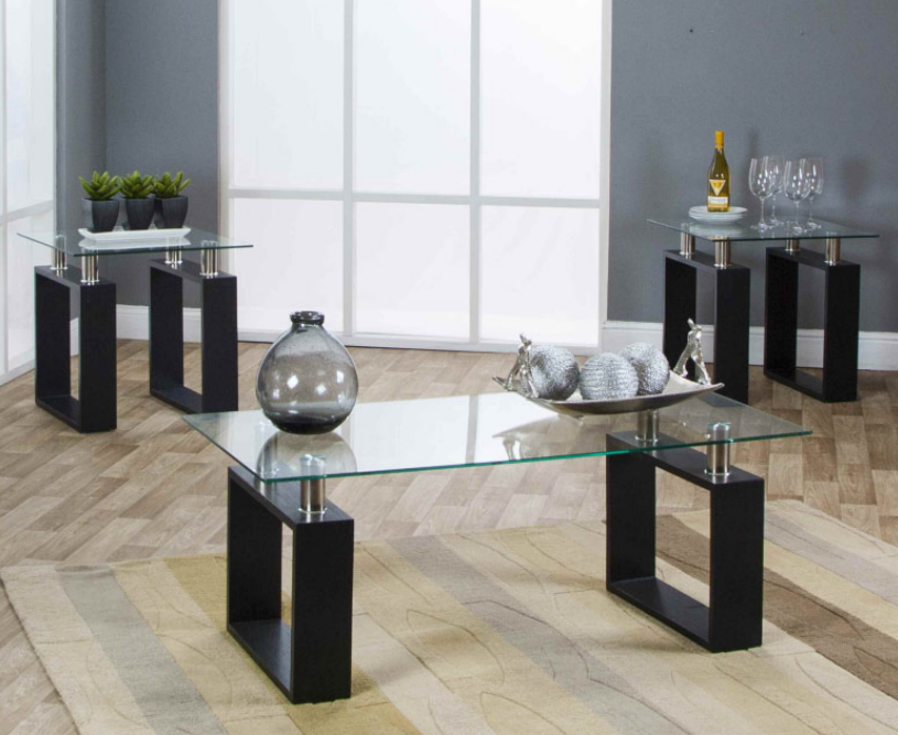Includes 3pk Tempered Glass Occasional Table Tops, and 3pk Black Woodgrain/Stainless Steel Occasional Table Bases