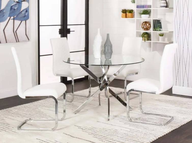 Gather around with this dining set from the Bravo/Murano collection, in the set includes a round dining table with chrome legs and chairs with white polyurethane and chrome legs. Make a statement by including this dining set in your home.Read More