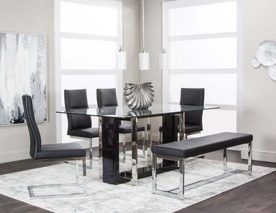 This Cramco Casual Dining Olympia 6 Piece Black/Chrome Dining Set features a high gloss black and chrome table base, 4 black side chairs and 1 black bench.