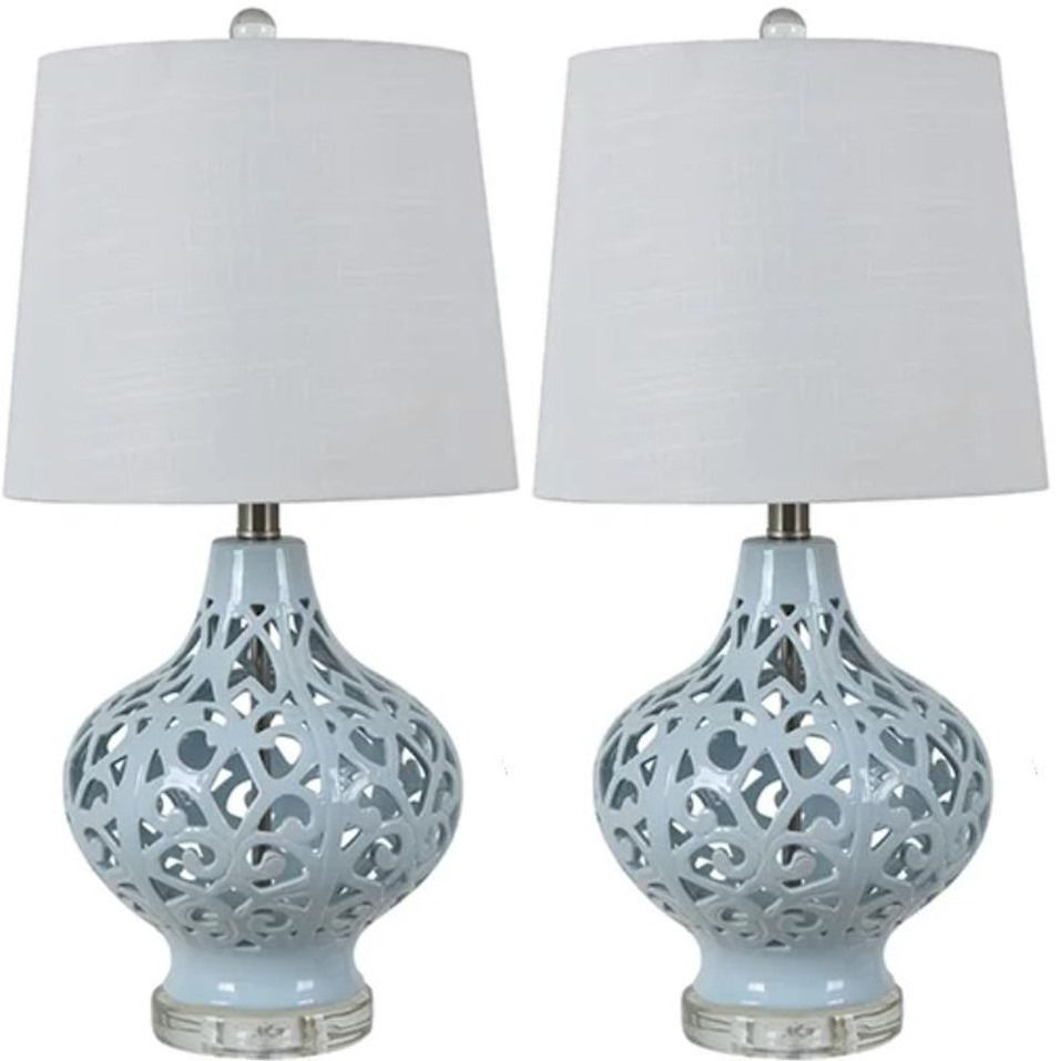 Add the combination of style and function with this eye-catching table lamp set from the Crestview Collection. Shown in light blue and white finish. Make a bold statement by incorporating this stunning table lamp set into your home.Read More