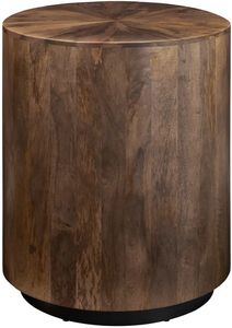 Ground your space with the warm tone and natural beauty of this round end table. Crafted from solid mango wood in a deep brown stained finish, the tabletop features a radiant sunburst pattern that enhances the wood’s rich grain. A cylindrical body rests on a black powder-coated iron base, providing subtle contrast and lasting stability.Read More