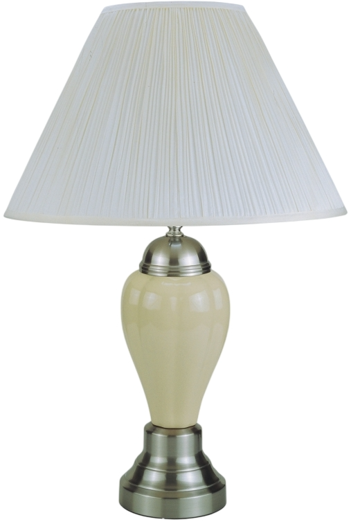 Illuminate your space with this elegantly crafted table lamp. Featuring a glossy ivory base and contrasting metallic details, it's perfect for a modern look. The broad, pleated shade offers a diffused light ideal for any setting.Read More