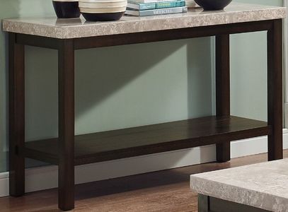 Simple and clean, this Kelia Sofa Table from Crown Mark will make an easy addition to your living room. Featuring substantial square legs supporting the faux marble table top and one shelf.Read More