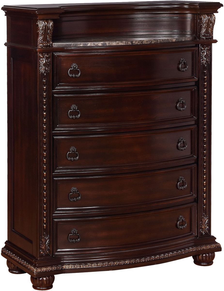 With opulent traditional charm, this bedroom group will make a great addition to any home. The Stanley Collection has copious details such as bun feet, ornamental pilasters, marble tops, crown molding, and a stately sleigh with an upholstered headboard panel. Incorporate your dream bedroom with this chest and other Stanley collections.Read More