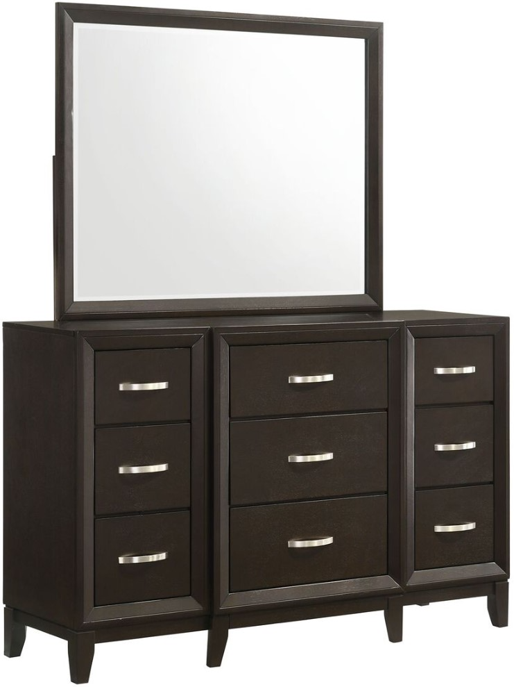 Sleek and beautiful dresser with mirror piece with simple design that will complement any bedroom. The nine drawers provide ample storage for personal belongings to be put away and secured. Place anywhere in the room to add that extra layer of tidiness and organization in a contemporary style.Read More