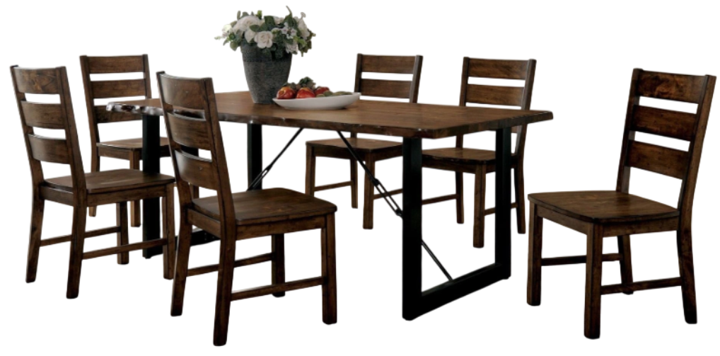 Recreate the feeling of the great outdoors with this industrial inspired dining set. Live edge accents create a natural woodsy feel with sophisticated texture that catches light along sides of the table and bench. Ladder back chairs are rich and rustic, offering uncompromised comfort with angled back rests while the wooden bench provides versatile seating with its smooth wooden seat and distinguished chain-link detail. With bold U-shaped supports and mimicking chain-links, the dining table completes with spacious room for six and a balanced walnut finish.