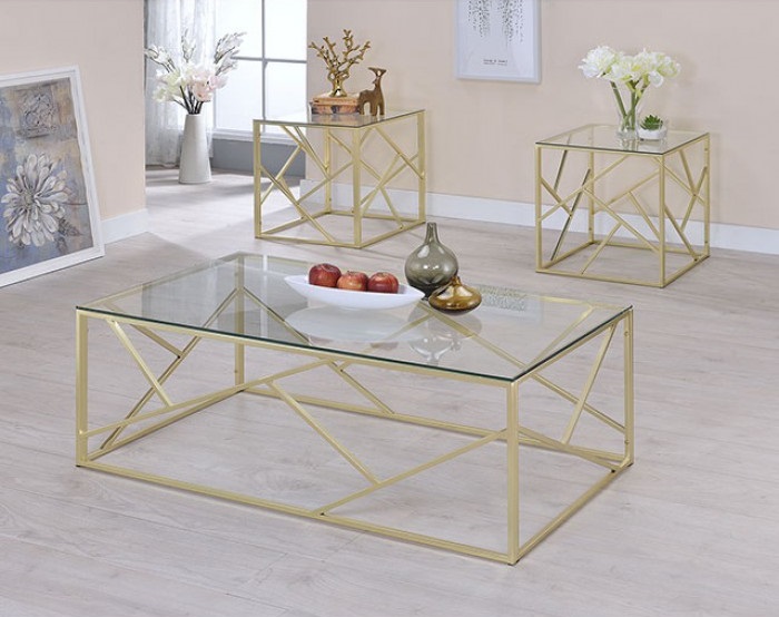Take home this stylish table set to accentuate your living space. This contemporary piece features sophisticated criss-cross metal framework and tempered glass tops that adds a contemporary touch to the design. Built on a metal framework that comes in 2 different finishes, this minimalistic set will complement any type of furnishing.