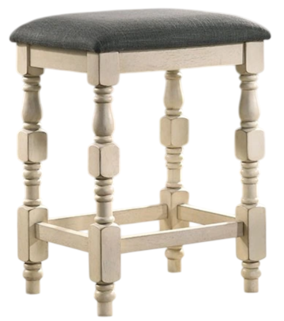 Create a sense of comfort with this vintage ivory and dark gray stool supported by turned legs. Seat is padded and upholstered in gray fabric, which offer a nice contrast to the lighter wood finish.Read More