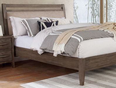 A linen-like fabric padded headboard highlights this bedroom set with a pronounced warm gray wood grain finish. It's a classic standard squared motif that not only makes a great fashionable statement but it adds a sense of sophistication as well.