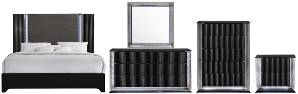 Modern Deco ambience is taken to the limit in this dreamy, moonlit bedroom suite. The classic upholstered headboard is set off by fluted lacquer and chrome details. A gentle push on the fluted, black lacquer fronts opens the generous storage drawers without the need for traditional pulls.Read More