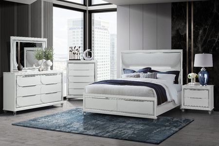The Caleb Bed is a masterpiece of design, featuring an elegantly upholstered headboard that not only provides exceptional comfort but also includes ambient LED accent lighting, creating a serene and inviting atmosphere. The practicality of the bed is enhanced with footboard storage, offering a clever solution for keeping your space organized and clutter-free. Complementing the bed, the Caleb Dresser, Nightstand, and Chest are marvels of craftsmanship. The case goods shine with their textured drawer fronts, which add a layer of depth and intrigue to the aesthetic. Sleek chrome drawer pulls complete the look, providing a striking contrast and ensuring easy access to your belongings. The pieces provide ample storage and sturdy construction, ensuring that style and function go hand in hand.