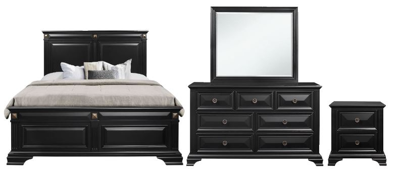 Included: One queen panel bed, one dresser, one mirror. one nightstand
