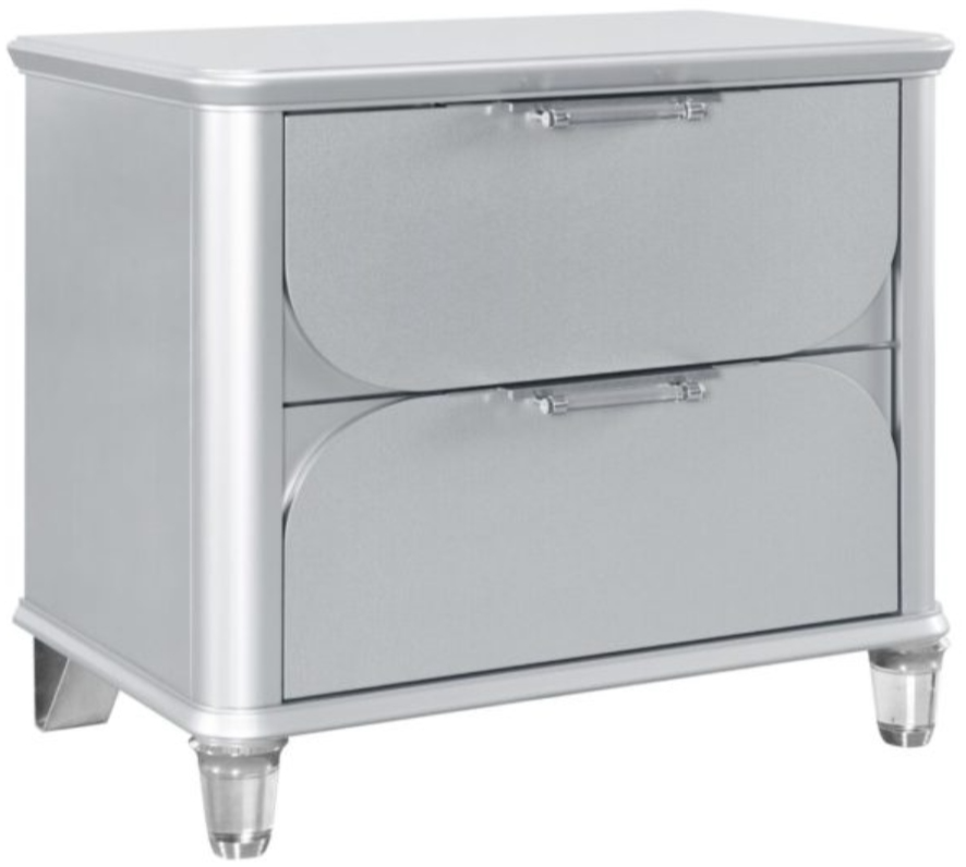The Lando Nightstand is a stylish and functional addition to your bedroom. With its grey finish and acrylic accents, this nightstand provides convenient storage space with its full extension drawers and top felt-lined drawer. The textured drawer fronts enhance its contemporary design, ensuring it complements the rest of the Lando Collection beautifully.Read More