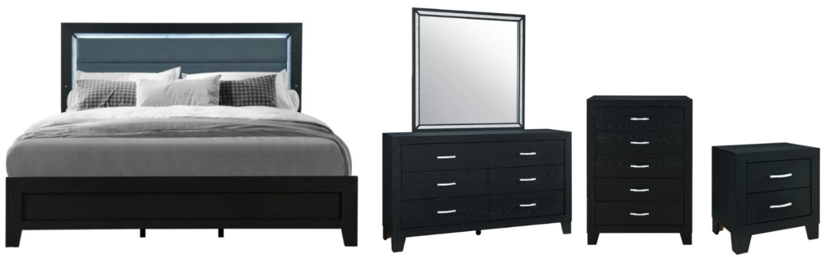 Set includes queen bed with LED, nightstand, mirror, dresser, chest