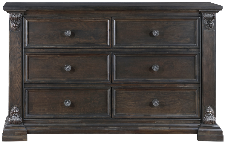 The elegant stature of the Cornwall Collection is solidified in its prominent placement in your bedroom. The dresser features corbel accented pilasters, and traditional framing. An espresso-hued finish complements the oak veneer of the piece while flat black knob hardware fronts the drawers of the dresser.Read More