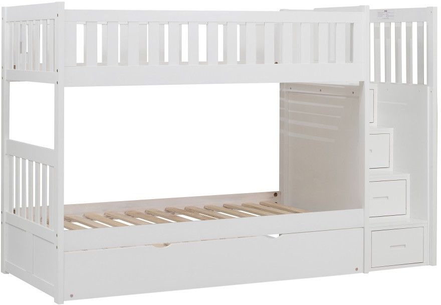 Maximizing sleep space is achieved with the stylish Galen Collection. This transitional twin over twin reversible storage stairstep bunkbed is featured in a white finish making it an appropriate choice for a number of youth bedroom settings.Read More