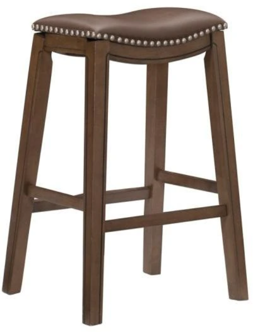 he stool is offered in three heights - 24-inches, 24-inches and 18-inches. The brown finished wood legs and seat apron feature routed accent while the brown faux leather seat features nailhead trim that further defines the stool’s profile. 4 additional seat colors are available – brown, red, green and gray – in each stool height.