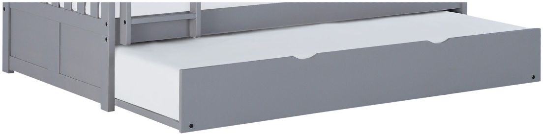 The transitional design of the Orion Collection’s twin trundle - featured in a gray- makes it a functional addition to your chosen bed selection. Also available: twin over twin bunkbed, twin over full bunkbed, full over full bunkbed, twin over twin trundle bed with two built-in drawers, underbed dual toy boxes, dresser and mirror. Providing flexible options to fit any size bedroom is the Orion Collection. This transitional bedroom group is featured in a grey finish making it an appropriate choice for a number of youth bedroom settings. With twin over full, twin over twin, full over full configurations, captains bed with a trundle that features two drawers, and twin/ twin bunk with storage stair steps – the collection’s design allows you to choose the size that is right for your family. Two under bed options are also available for the bunk beds – dual toy boxes or pull-out trundle. Additional storage comes in the form of the coordinating dresser, mirror, chest and nightstand.