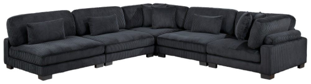 Configurable to your available space, the Traverse Collection allows for the addition and detachment of pieces for a customized seating experience. The 5-piece sectional configuration consists of two corner units paired with three armless chairs. The plush black corduroy fabric upholstery creates a plush expanse for a soft touch experience.Read More