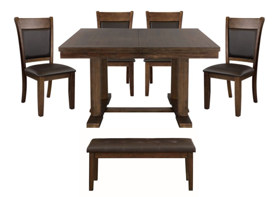 Set includes: One dining table and four side chairs and one bench
