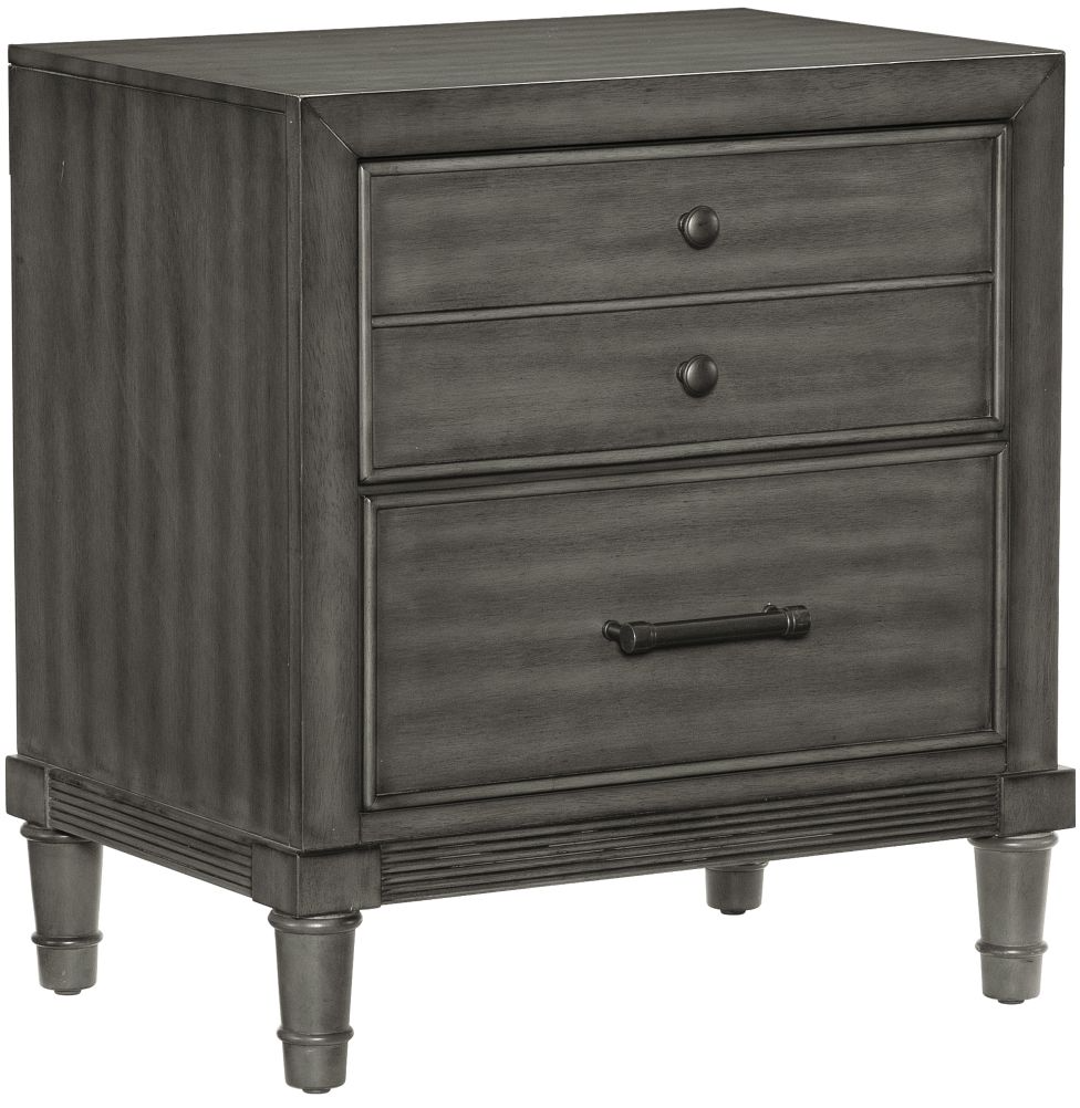 Modern convenience is paired with transitional style to create the versatile look of the Wittenberry collection. The nightstand’s gray finish over okume veneer is complemented by the dark bronze finished knob and bar hardware that fronts the framed drawers of the piece.Read More